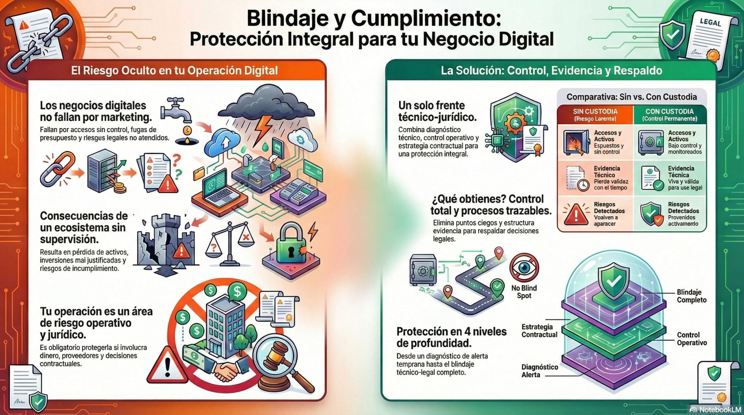 Servicio técnico–operativo + validación jurídica que detecta pérdidas, riesgos, incumplimientos y fallas en tu operación digital para proteger tu negocio antes de que haya un problema mayor.